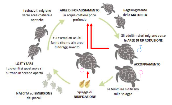 la maturità sessuale viene raggiunta in entrambi i sessi tra i 15 e i 30 anni di età. L’accoppiamento avviene prevalentemente lungo le rotte migratorie tra le aree di foraggiamento e le aree di nidificazione. La nidificazione avviene in primavera-estate, lungo le spiagge poco pendenti e sabbiose delle regioni temperate e subtropicali di tutto il mondo. Le femmine depongono da uno a sei nidi durante una stessa stagione riproduttiva, che avviene ogni 2-4 anni, e ogni evento di deposizione è distanziato dall’altro di circa 12-15 giorni. Ogni nido arriva a contenere dalle 50 alle 180 uova e l’incubazione dura circa 45-60 giorni in funzione della temperatura della camera di incubazione. La temperatura di incubazione delle uova gioca un ruolo fondamentale anche nella determinazione del sesso dei futuri nascituri: il 100% dei maschi viene prodotto a temperature più fresche, attorno ai 27°C, mentre il 100% delle femmine viene prodotto a temperature più elevate, attorno ai 31°C. Il rapporto 1:1 tra i sessi viene prodotto a una temperatura a metà strada tra i due estremi, ovvero a circa 29°C. L’emersione dei piccoli avviene tendenzialmente di notte per evitare la disidratazione e per ridurre il rischio di predazione.